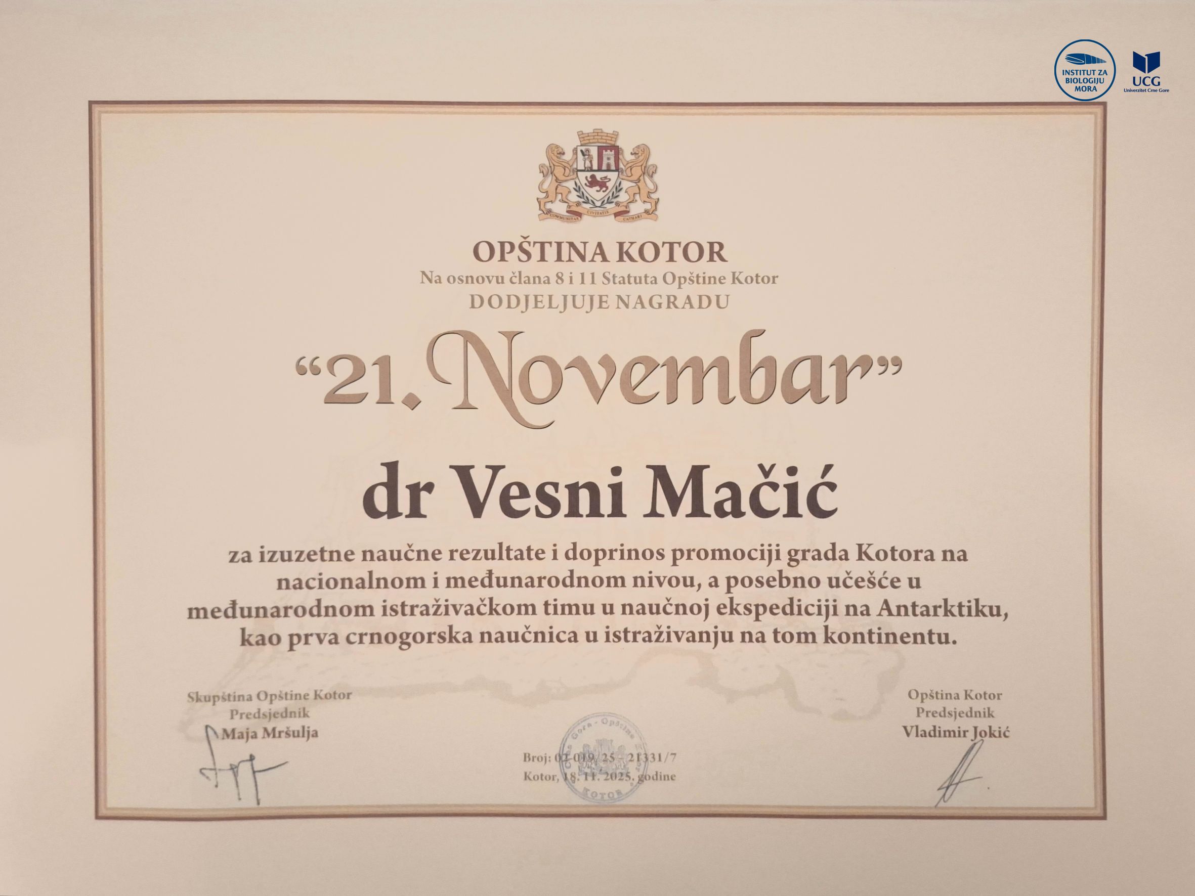 At the formal session marking the Day of the Municipality of Kotor, Dr Vesna Mačić, Research Advisor at the Institute of Marine Biology of the University of Montenegro, received the municipality’s most prestigious recognition – the “21 November” Award. This distinction is presented for outstanding merit and achievements of special importance for the development and promotion of the town.